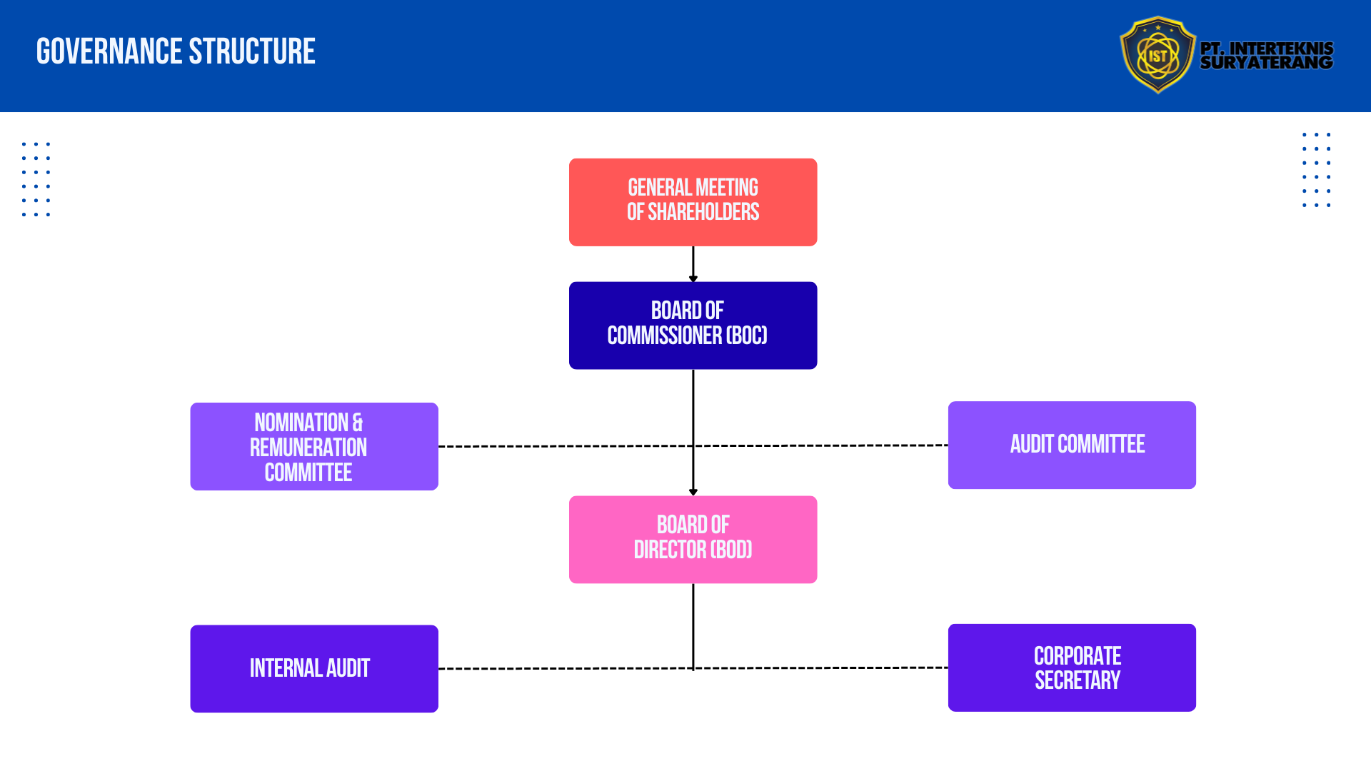Sesuai dengan Undang-Undang No. 40 Tahun 2007 tentang Perseroan Terbatas dan Undang-Undang Pasar Modal di Indonesia, struktur Tata Kelola Perusahaan yang Baik dituangkan dalam badan pengurus kami, yang meliputi Rapat Umum Pemegang Saham Tahunan (RUPST), Dewan Komisaris, dan Dewan Direksi.